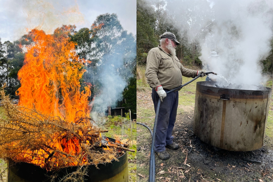 [Images by Zelah Dutta-Nielsen of green waste burning in the biochar kiln and Cr Bill Harvey hosing down the burnt material]