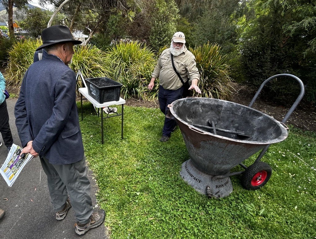 [Image by Zelah Dutta-Nielsen of Cr Bill Harvey showing someone the biochar kiln]